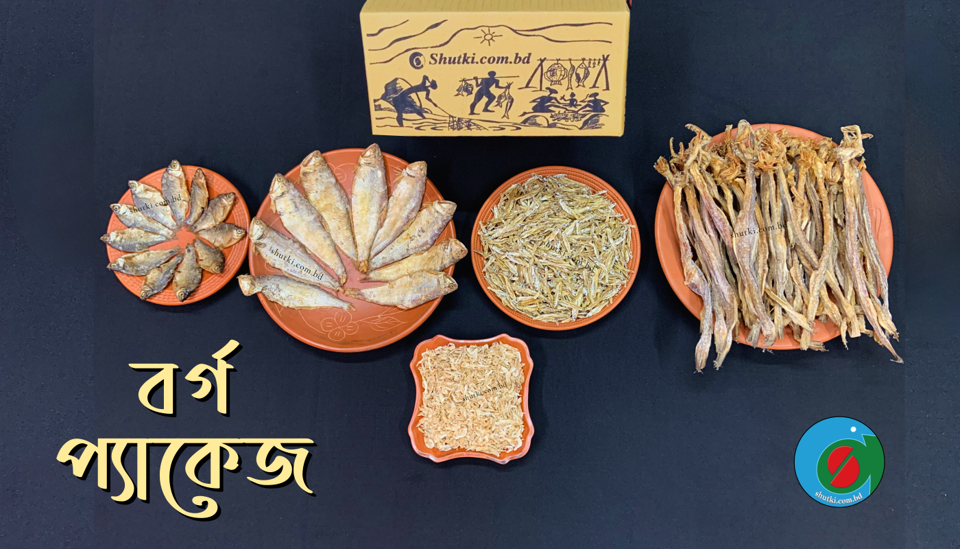 প্যাকেজটিতে রয়েছে চ্যাপা শুঁটকি, দেশি শুঁটকি ও সামুদ্রিক শুঁটকির বৈচিত্র্য।